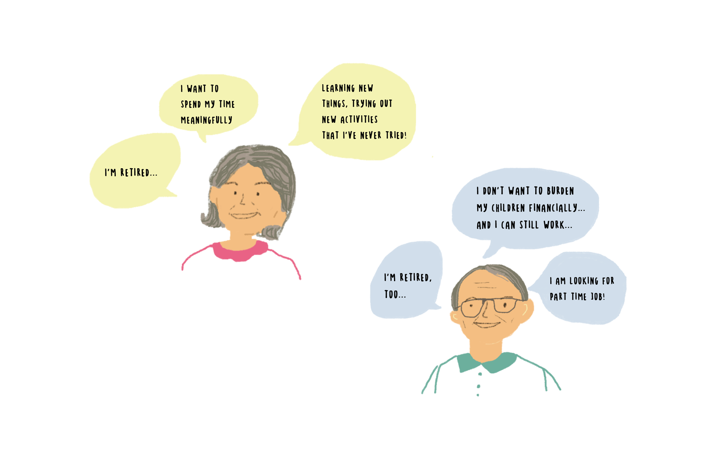 For example, Racheal may want to explore interesting activities and learn a new skill in order to spend her free time more meaningfully, while Joshua wants to earn a living though part-time work as he doesn’t want to be a burden to his children. Accordingly, leisure or learning programmes and services for senior groups would be something Racheal desires to have, however it won’t be highly prioritized in Joshua’s scenario.