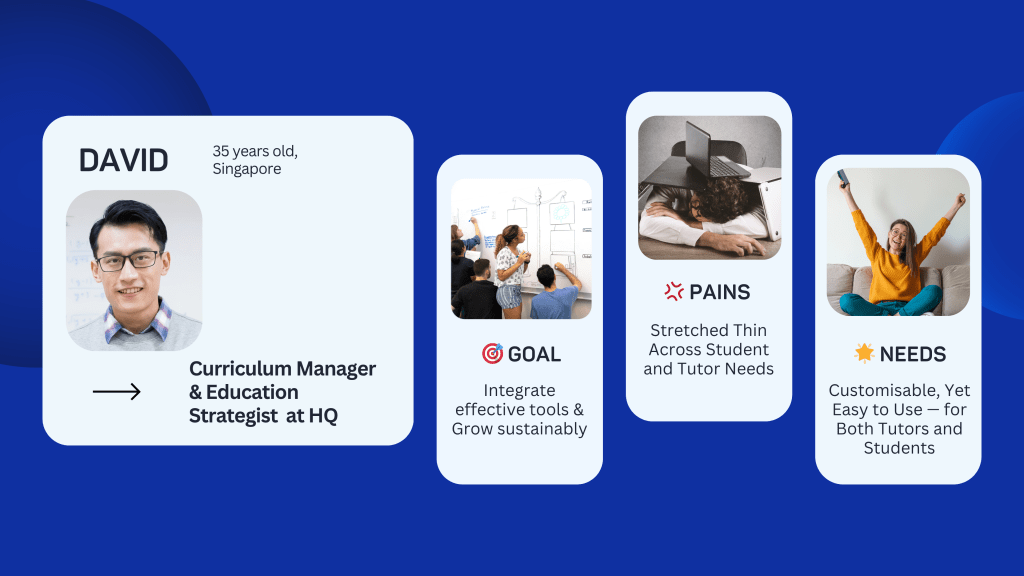 To explore more targeted business opportunities, we follow the journey of David — a curriculum manager and education strategist at the headquarters of a growing tuition centre.