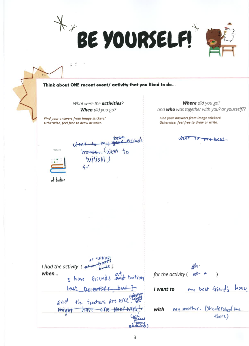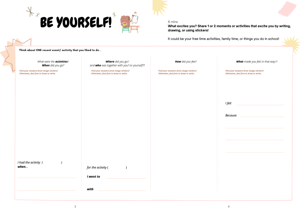 We designed participatory workshop activities via workbook format where kids can participate in, that is designed to empower them to express their thoughts and emotions. It consists three major activities in the workbook.