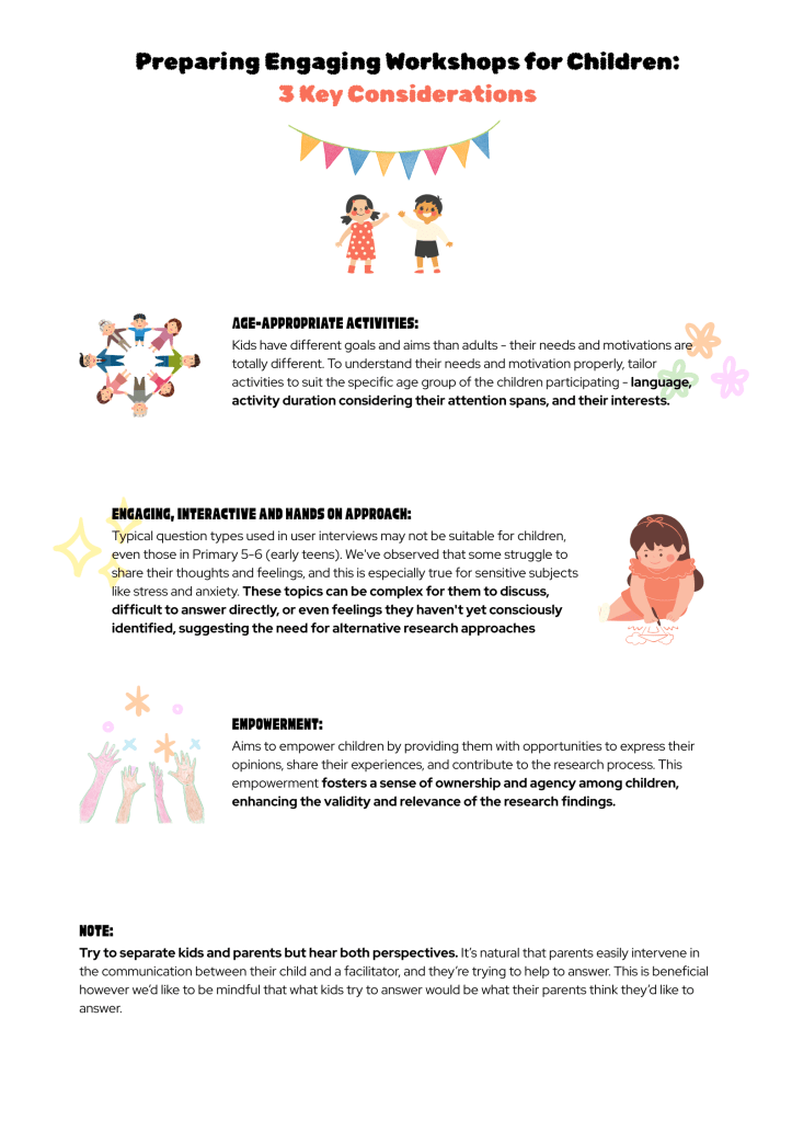 Participatory workshops go beyond traditional interviews but help children immerse in engaging activities to give us insights to the research questions. This approach helps researchers set aside their own assumptions and uncovers hidden logic and motivations adults often overlook. Instead of relying solely on answers to direct questions, these workshops allow children to express their needs, ideas, and feelings naturally through play and interaction.