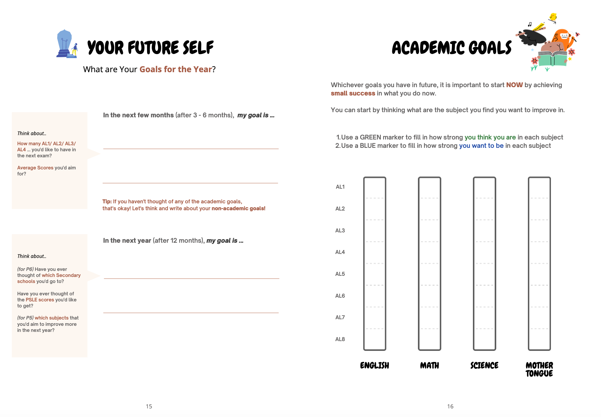 This activity was designed to evaluate children’s capacity for autonomous goal setting, reflecting their maturity and thoughtfulness. We sought to understand the types of goals they would choose and how they envision achieving them, without any parental guidance. Instead of inquiring about previous experiences with goal setting, we presented a goal-setting task to directly observe their comprehension of the concept and their independent approach to it.